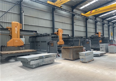 該機采用PLC可編程控制系統和人機操作界面,輔以高精度旋轉編碼器定位及紅外線標線器,左右行走及前后分片采用雙變頻器控制,可根據石材材質進行調速,上下升降采用液壓升降,結合鍍鉻導柱+耐磨導套,配合間隙小,耐磨美觀,并在導套內設計多層密封,防水防塵防漏油,提高使用壽命。工作臺采用超重型大規格型材焊接而成,承載重量更大,更穩固耐用。關鍵部位均采用進口零部件,因而具有切割效率高、穩定性高、操作簡便等優點,特別適用于異形、墓碑、路沿石的切割。
